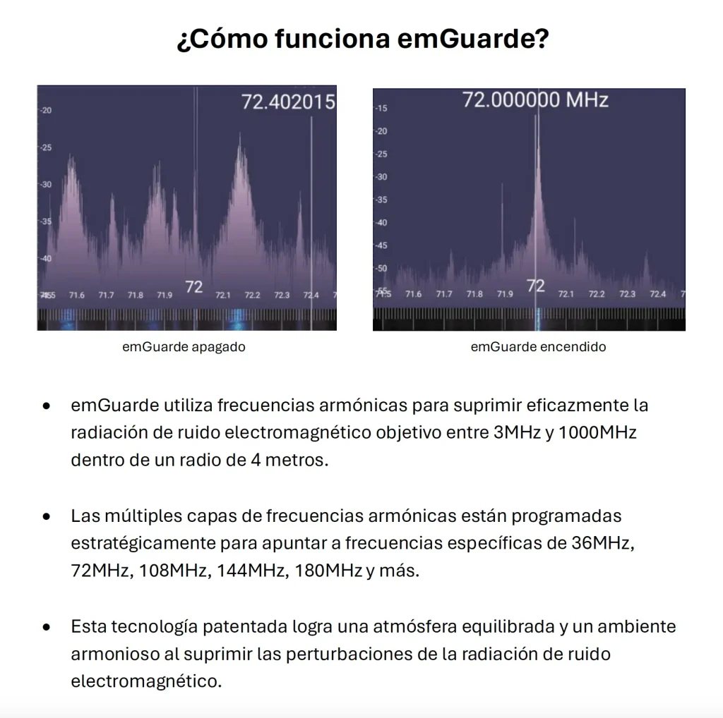 emGuarde utiliza frecuencias armónicas para suprimir eficazmente la radiación de ruido electromagnético objetivo entre 3MHz y 1000MHz dentro de un radio de 4 metros.